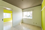 2Kから1LDKに間取りを変更したリノベーションです。洋室とキッチンは開放的なリビングダイニングキッチンに、さらに和室は洋室に変更しました。壁には鮮やかなイエローグリーンのアクセントクロスを採用し、ダークブラウンの天井と美しいコントラストを生み出しています。